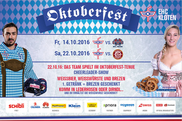 Am 14. Oktober (gegen den EHC Biel) und am 22. Oktober (gegen Genève-Servette) herrscht Oktoberfest-Stimmung in der Swiss Arena. Die Zuschauerinnen und Zuschauer kommen einerseits in den Genuss eines einmaligen EHC-Kloten-Tenues am 22. Oktober, andererseits profitieren sie von verschiedenen Aktionen im Stadion: Bei der Konsumation des ersten Getränks im Stadion schenkt der EHC Kloten eine Brezen gratis dazu. Selbstverständlich wird das gastronomische Angebot angepasst: Für einmal sind neben den gängigen Köstlichkeiten Weisswürste und Weissbier in der SWISS Arena erhältlich.